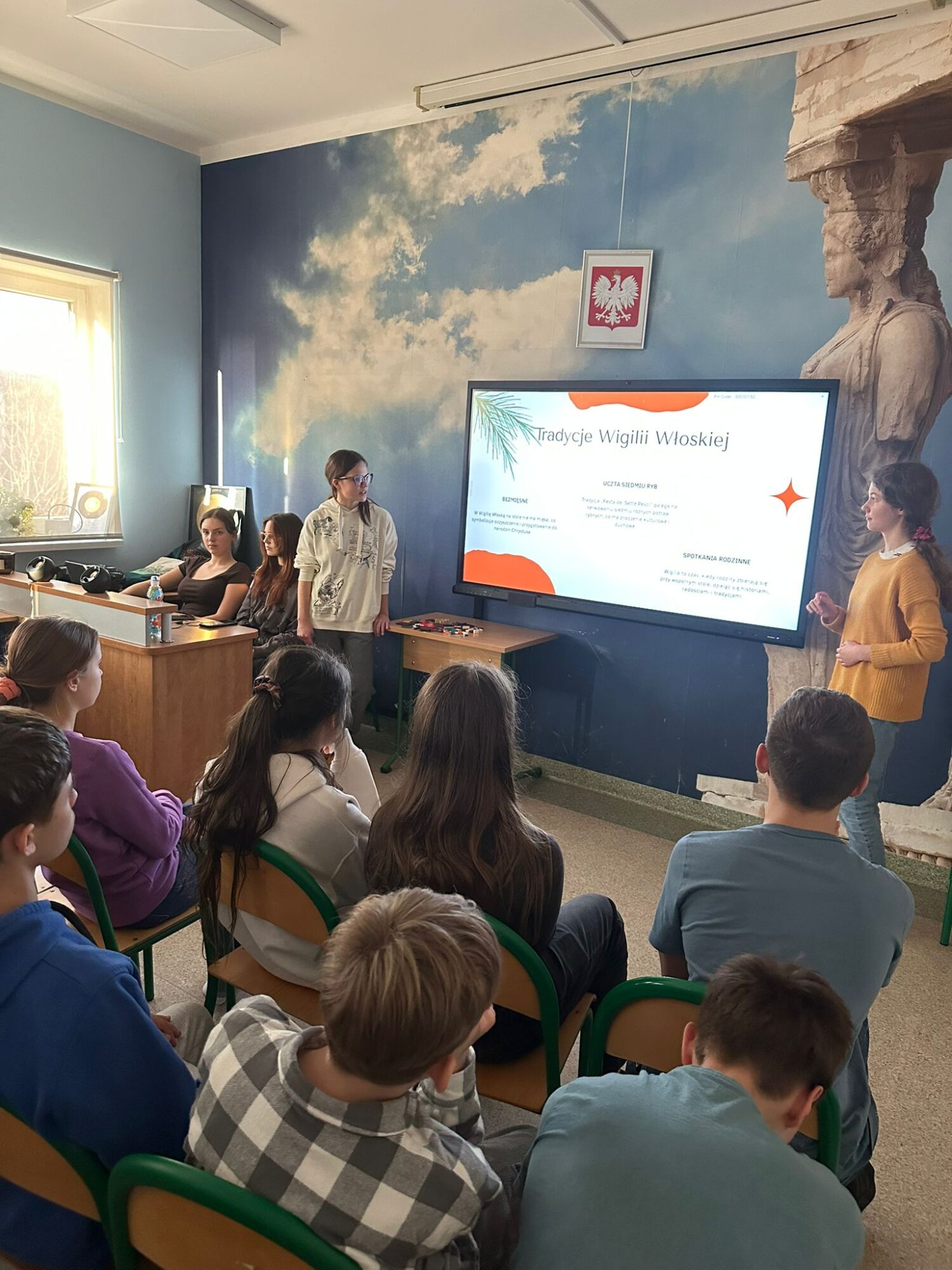 Uczniowie klas siódmych i ósmych zabrali młodszych kolegów i koleżanki w magiczną podróż po bożonarodzeniowych zwyczajach Włoch, Finlandii, Hiszpanii i Austrii.